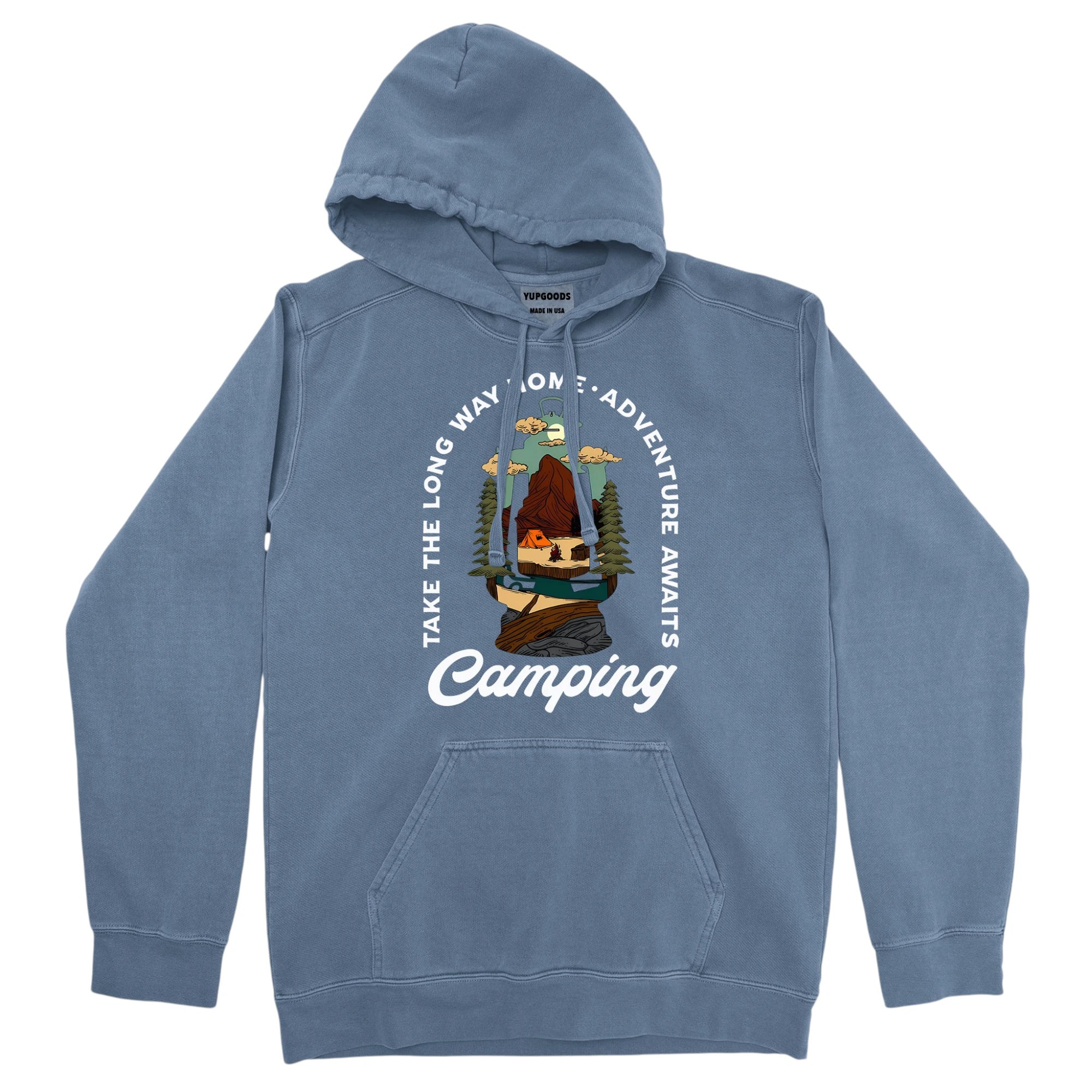 The Take The Long Way Home Adventure Awaits Camping Unisex Comfort Colors Hooded Sweatshirt is the epitome of cozy elegance, seamlessly blending comfort and style in a must-have piece for your cool-weather wardrobe.